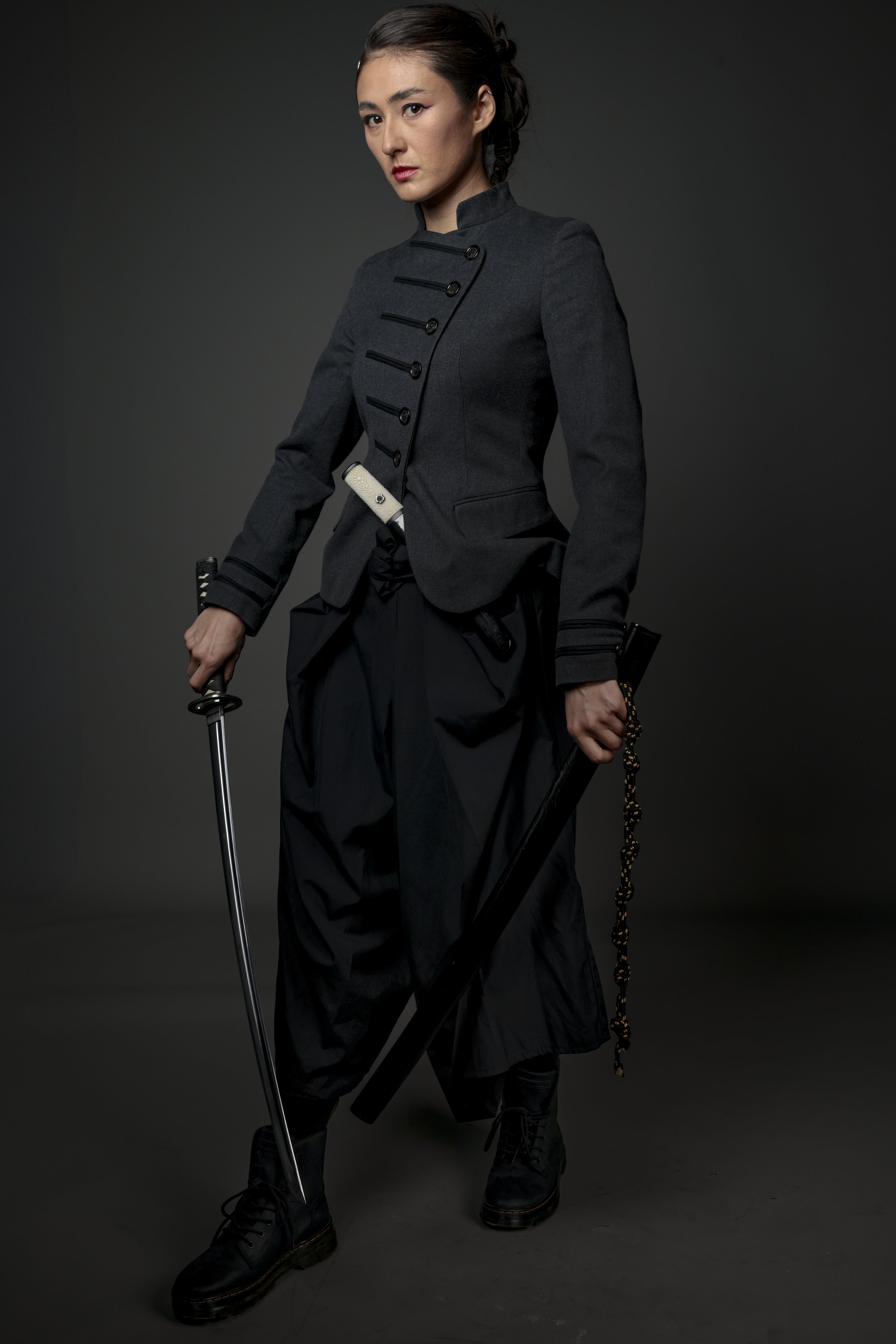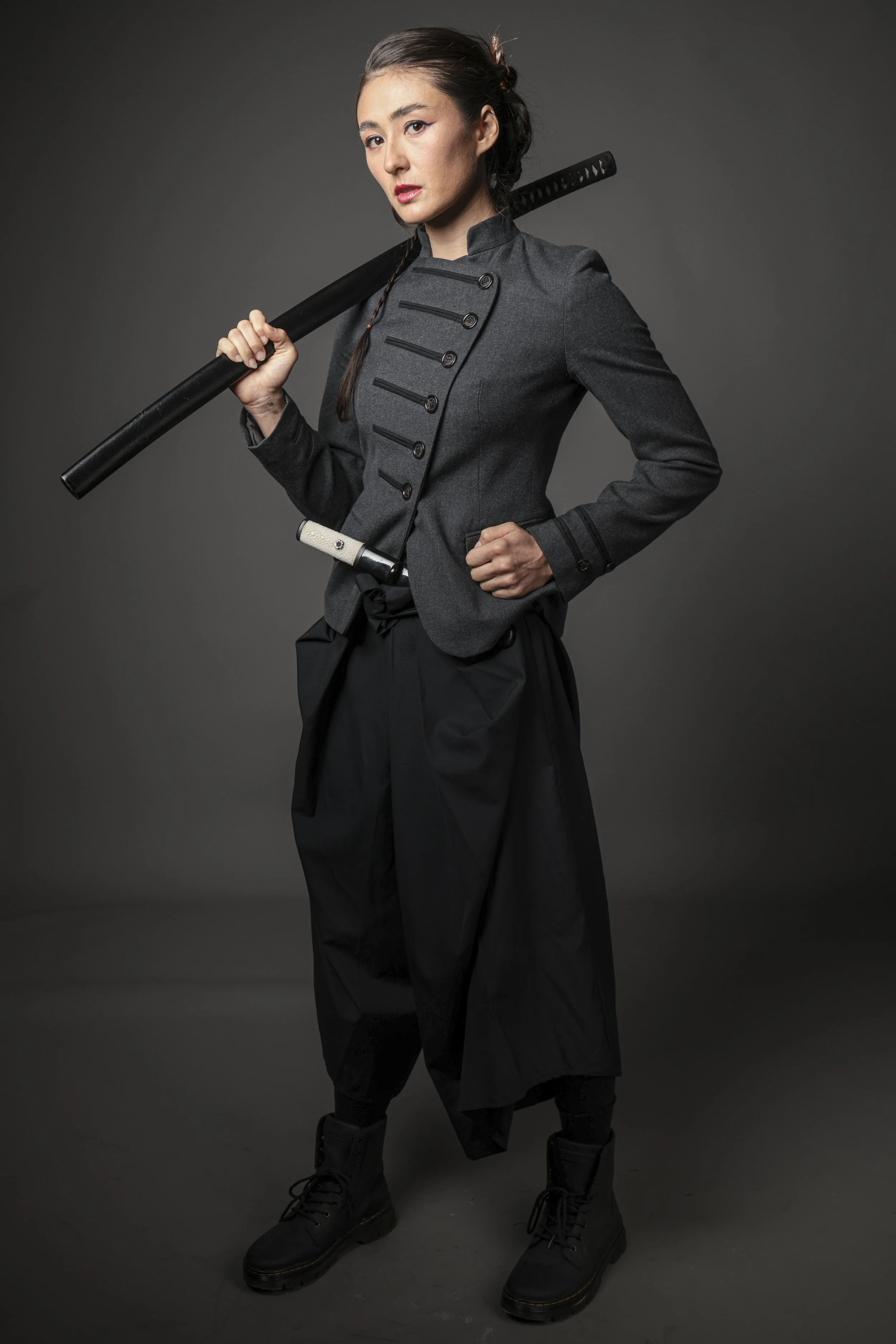 The heroine of this editorial is imagined as a ronin — masterless, autonomous, and uncompromising. She wears the hakama, a garment rooted in tradition, paired with a minimalist, militant jacket that signifies modern authority. Together, they create a dialogue between heritage and contemporary identity: a woman who honours the past but is unbound by it.