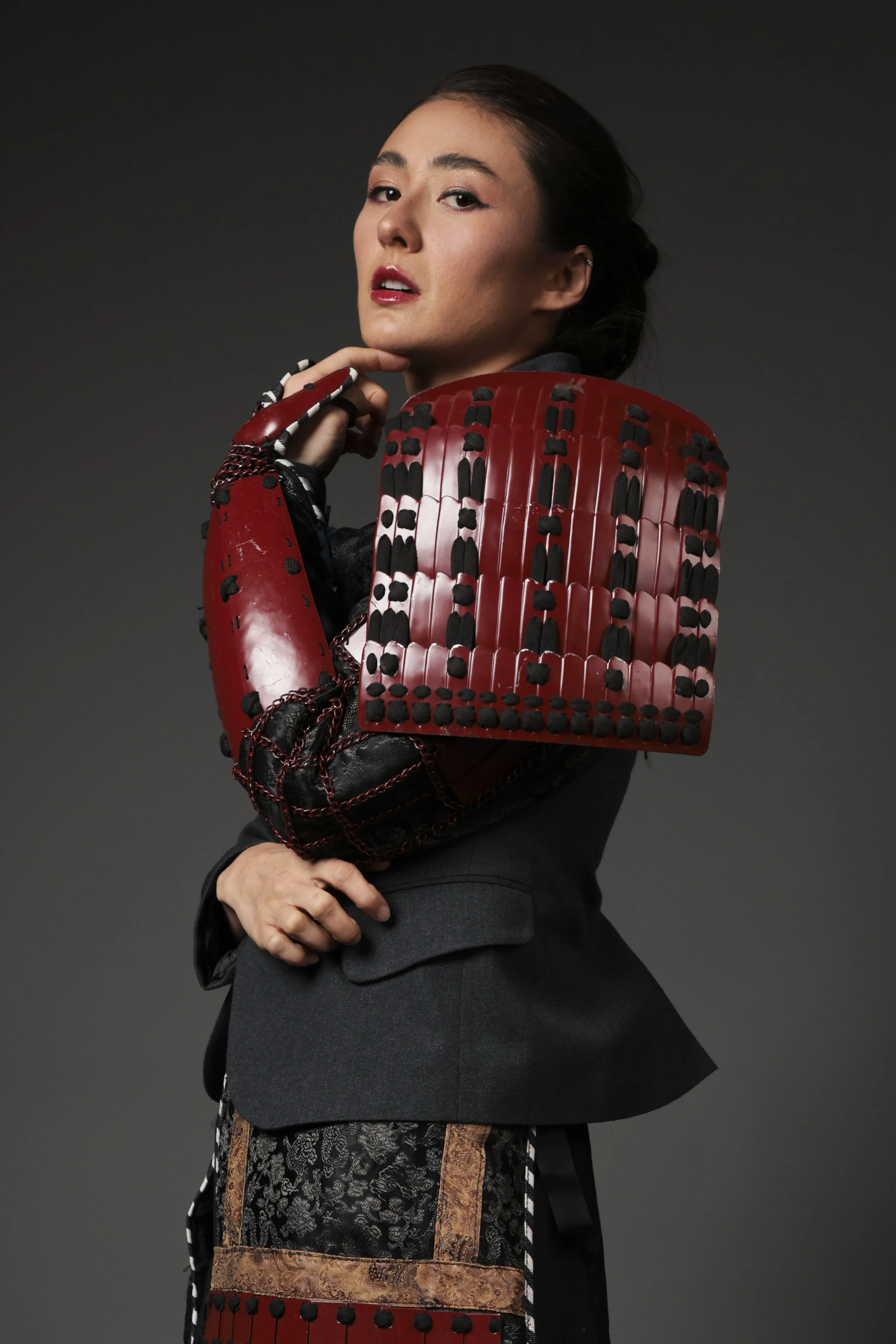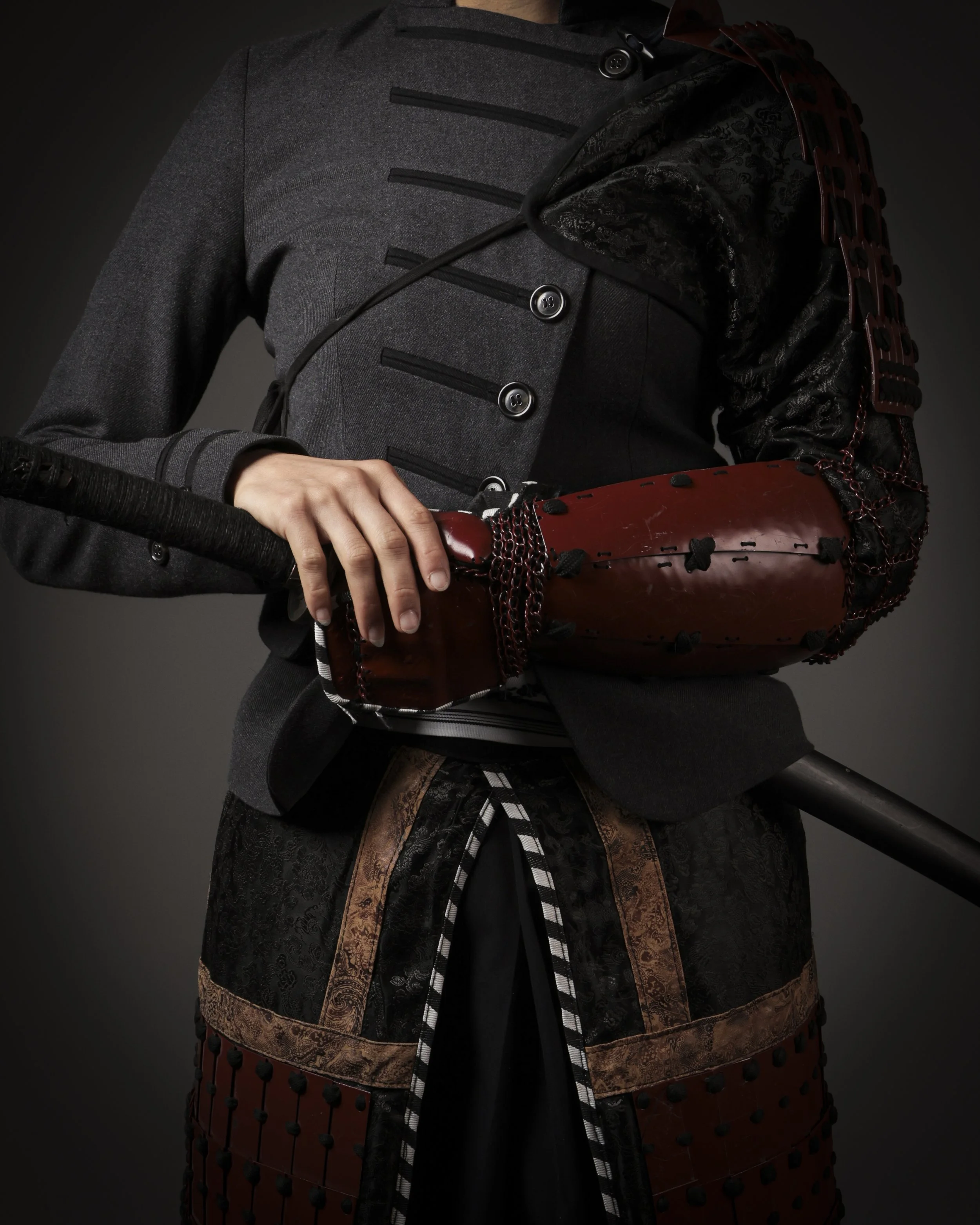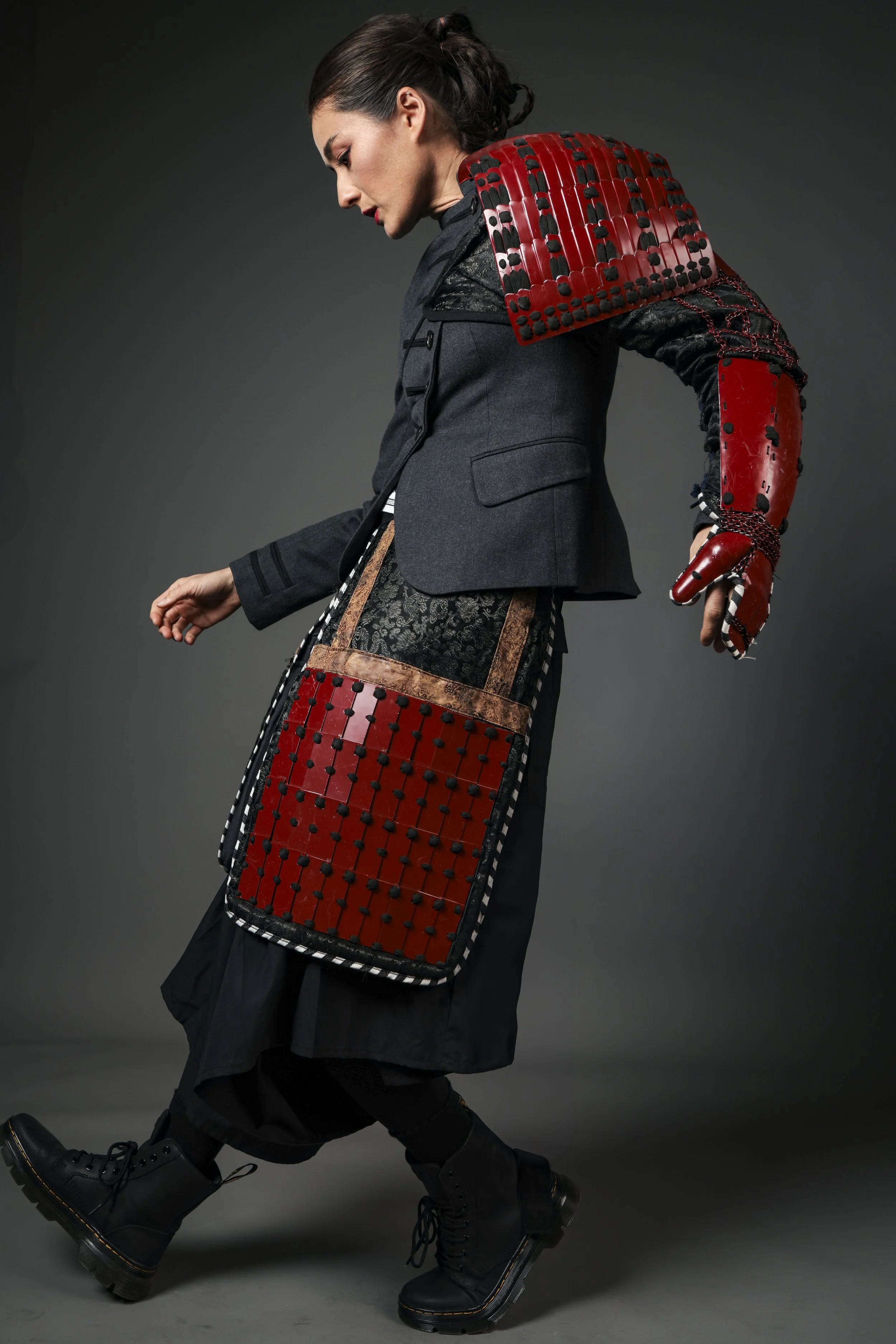 This shoot reimagines the Onna Musha to reflect the changing role of women in Asian society. Traditionally seen in kimono, not armour, women are here styled in yoroi-inspired elements, hakama, and a militant jacket. The contrast of heritage and modernity symbolises resilience, autonomy, and the breaking of patriarchal boundaries — a dialogue between strength and vulnerability.